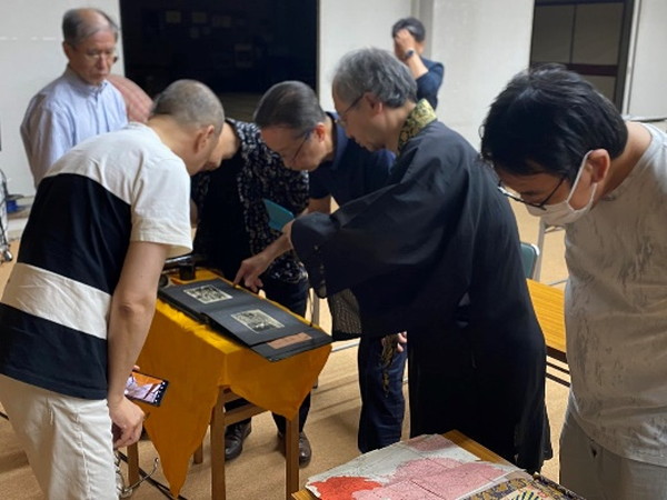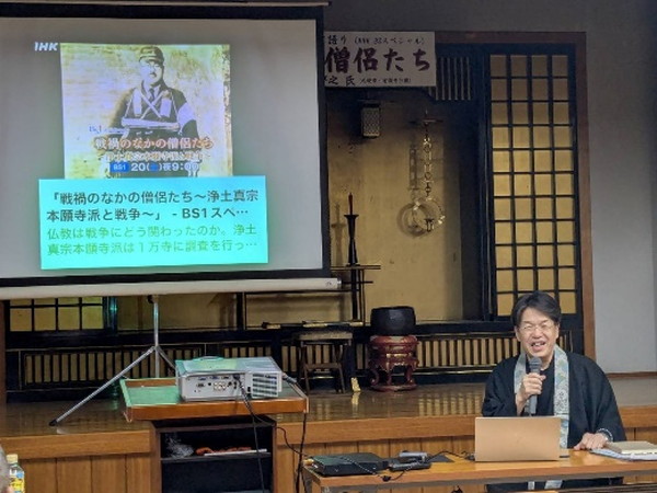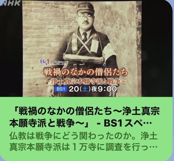 今年はあの痛ましい大戦から80年が経過いたします。7月8日に、「念仏者 九条の会」という志厚い僧侶の集まりにて、3年前にBS1で放送された「戦禍のなかの僧侶たち」という番組製作にあたり、戦時中、南京本願寺の輪番であった祖父のことで取材を受けました。その後日談や祖父のことについて語ってくれないかというご依頼を受け、私が知っている範疇でお話しをさせていただきました。当時、祖父が記録した戦禍の模様や携帯していた御本尊、引鏧などを持参し、そちらも手にとってご覧いただきました。