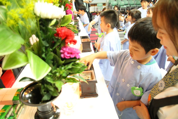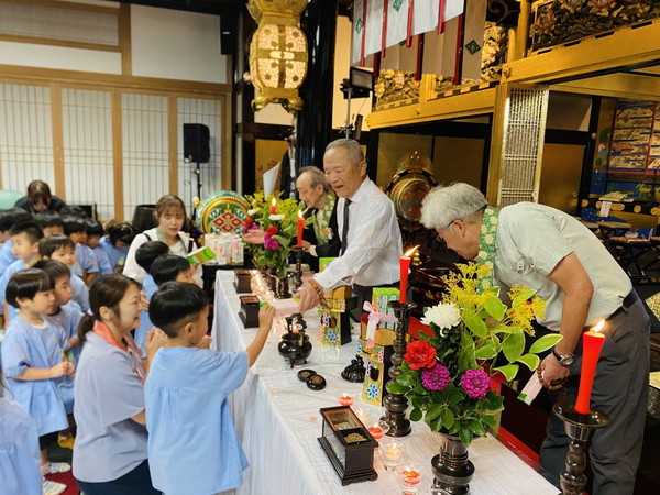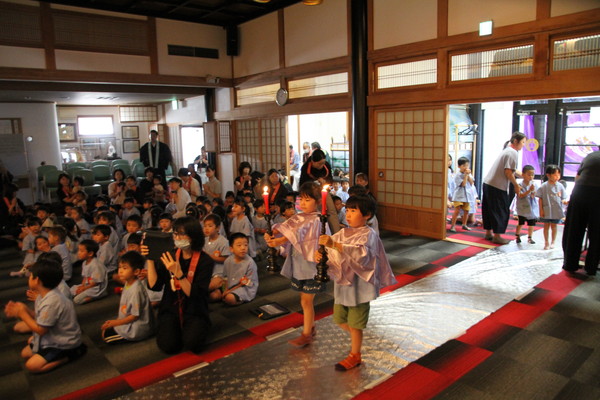 ご法要初日の午前中に、厚別幼稚園・第2あつべつ幼稚園のこどもたちが、報恩講におまいりに来てくれました。お光り(花あかり)やお花、お供物、お香をお供えして、正面をきれいに飾ってくれました!
