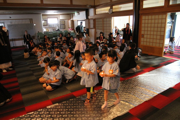 最後に一人ずつお焼香をして、総代さん、壮年会のおじさん達から、「よくおまいりしてくれたね!」と参拝のおみやげとしてお菓子をこども達に配っていただきました!