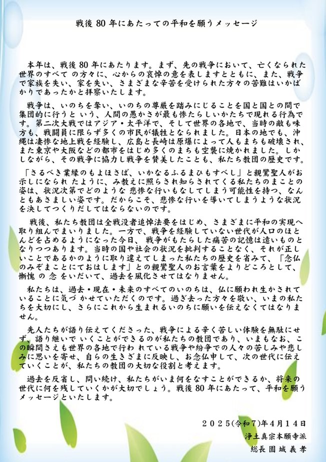 引き続き、園城総長より今年の4月に本山で開催された「平和フォーラム」に於いて発表された「戦後80年にあたっての平和を願うメッセージ」が読み上げられました。(このページ下部に掲載しています)
