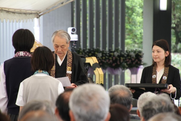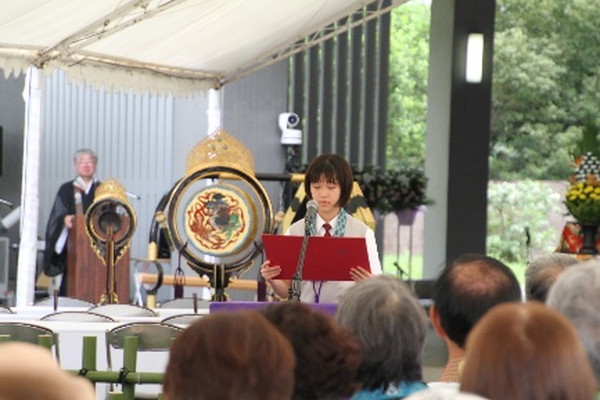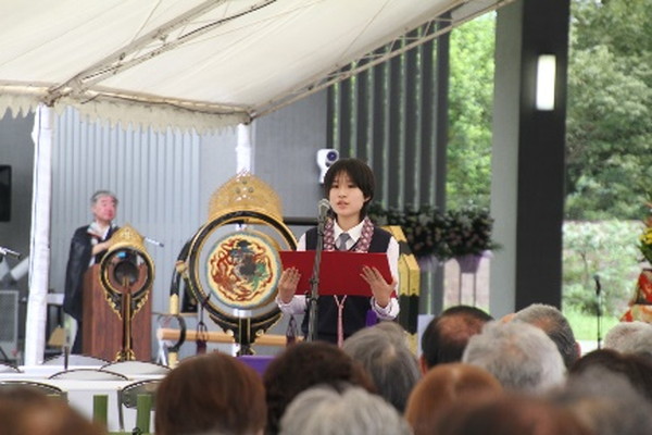 法要に先立ち、宗門関係学校生徒作文最優秀作文の朗読と表彰式が執り行われ、園城義孝総長より表彰状と記念品が授与されました。次代を担う若い方々に平和やいのちの大切さを考えていただこうという趣旨のもと毎年応募し、54通の中から選ばれたそうです。