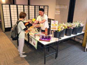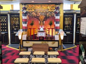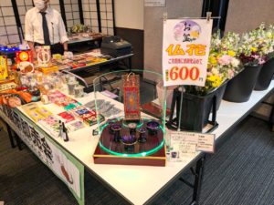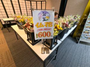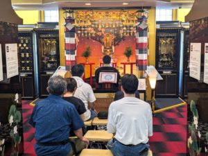8月12日は毎年、午前中に役員会を開催した後、里塚霊園の安楽寺六角堂へ役員の皆様とご一緒におまいりさせていただいております。8月13日からは、お寺の納骨堂でお盆の勤行をさせていただきました。今年も期間中、老若男女問わずたくさんの方々がお寺におまいりいただきました。お香の清らかな香りに包まれ、先人をお偲びさせていただきました。そして今年から納骨堂の入口付近にて仏花の販売、あみだ堂仏具店の展示即売会等を開催させていただきました。また小さなお子さんが楽しめるよう室内にて輪投げあそびを行ったり、屋外ではキッチンカーにてかき氷やシェイクを楽しむみなさんも多くおられたようです。