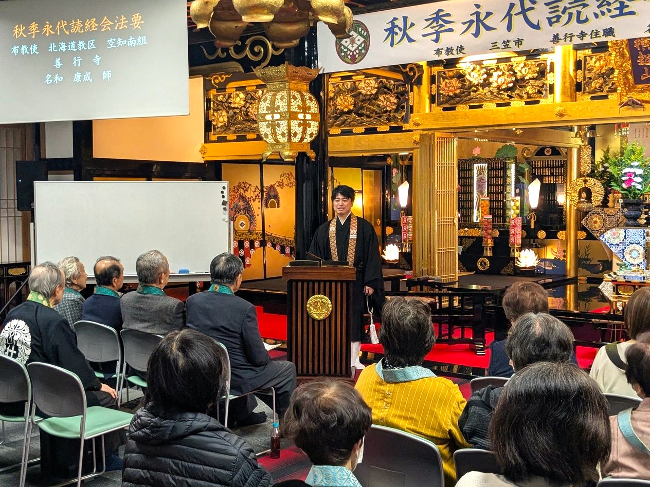 去る11月28日~30日の日程で、「秋季永代読経会法要」をお勤め致しました。この法要は亡き人を通して、いろんなことを思い、いろんな考えに出遇わせていただいたことと思います。気づかせていただいたことが沢山あると思いますが、その中でも自分のいのちの行く末を考えるご縁をいただけたことが、一番大きな出遇いではないかと思います。それを仏法に照らし合わせながら、この一度きりの人生をどう歩ませていただくかを考える大切なご縁であると私はいただいております。亡き人を偲びながら仏法、そして浄土真宗のみ教えをお聞かせいただく大切なご縁であります。それを明快におとりつぎいただきます布教使様として、一昨年ぶり5度目のご縁となりました空知南組 三笠市 善行寺住職 名和康成 師にご出向いただきました。