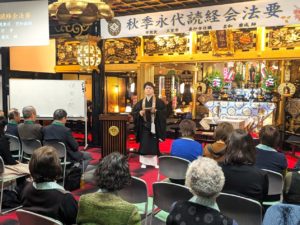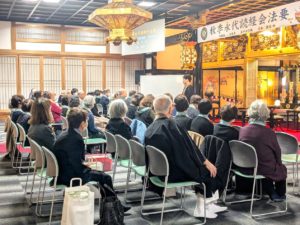 秋季永代読経会の最終日は「永代経開闢法要」を毎年併修させていただいております。この一年間で別納永代経懇志をお納めいただきました方々を対象としたご法要となります。大切な方との別れの縁の中でお聞かせいただいたお念仏のみ教えが、永代にわたりこの安楽寺から聞こえ、そして念仏の道場として栄えますようにと、志をお納めいただきました皆様と共にお勤めをさせていただきました。この度も三日間たくさんのご参詣を賜りました。お疲れになったことと思います。ご自愛下さい。